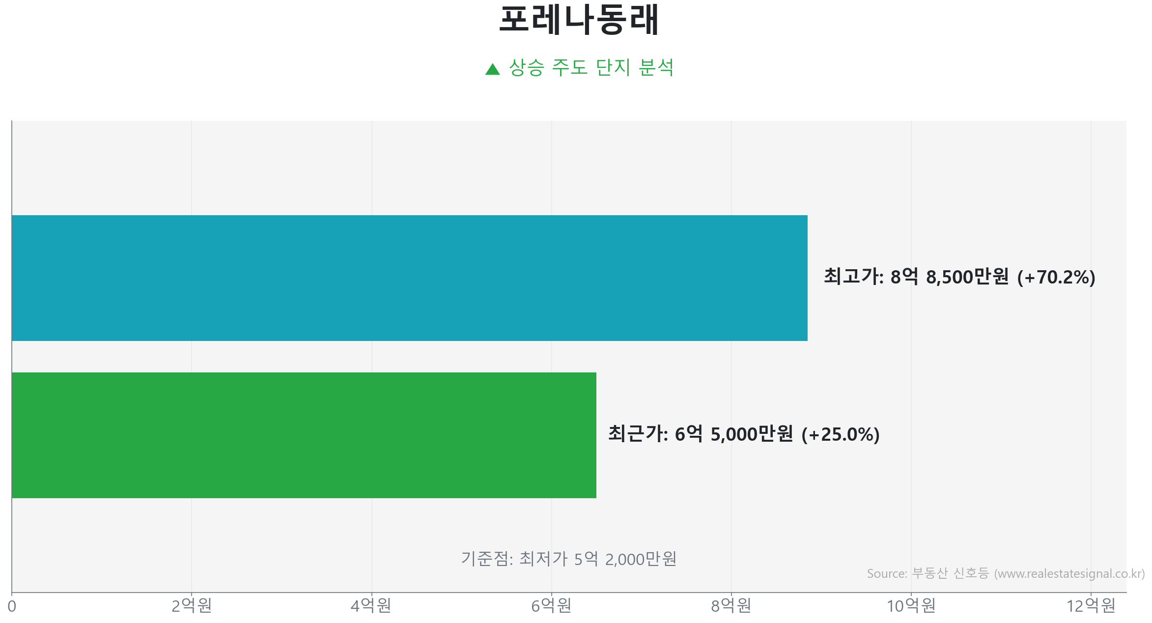 가장 먼저 주목할 곳은 낙민동 포레나동래 (84.0㎡)입니다. 732세대의 중규모 단지인 이곳은 준공 7년 차 준신축 아파트로, 현재 지역 내에서 완연한 상승 깃발을 든 대장주 역할을 하고 있습니다. 데이터 분석에 따르면 포레나동래는 세련된 커튼월룩 외관과 완벽하게 통제된 지상 공원화 환경을 무기로 상위 소득 계층의 수요를 독점하며 압도적인 유동성을 보여주고 있습니다.