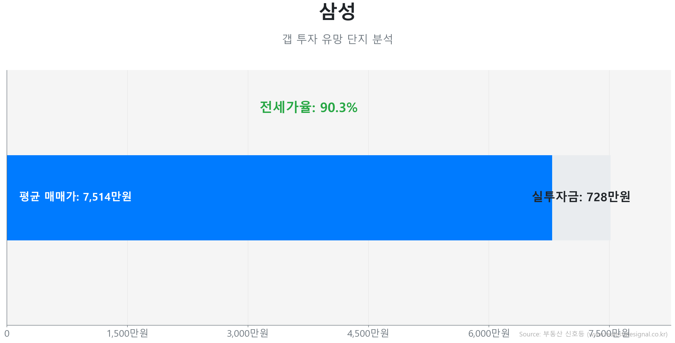 이어서 1994년 준공된 정동면 삼성(59.0㎡)은 지역 내 상대적 우위를 보이는 90.3%의 높은 전세가율을 바탕으로 실투자금 약 728만 원 수준의 극대화된 소액 투자가 가능합니다.