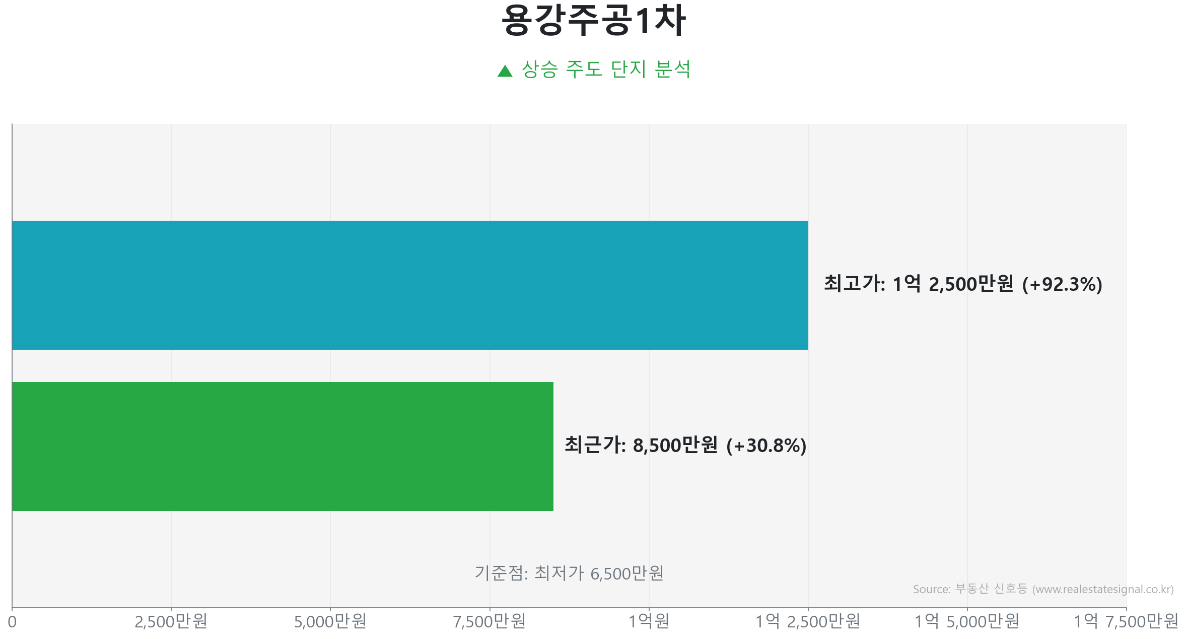 한편, 1999년 준공된(27년 차) 515세대 규모의 용강동 용강주공1차(49.0㎡)에서는 구축 아파트임에도 29건에 달하는 압도적인 유동성이 관찰됩니다. 가격 역시 저점 대비 무려 30.8% 반등하며 최근 8,500만 원(2026년 1월)에 실거래되는 활기를 보였습니다(최고가 대비 32.0% 하락).