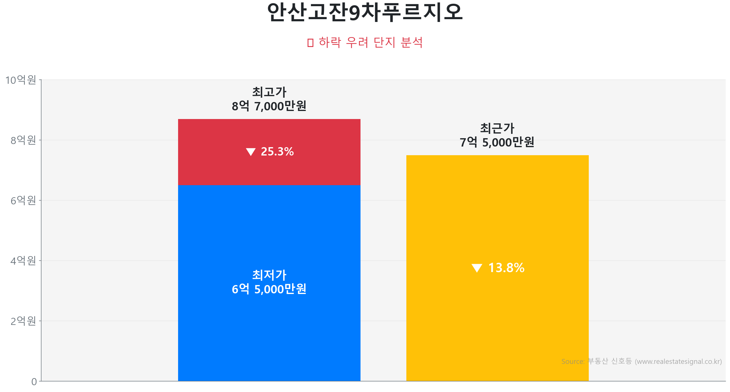 이어서 중소형의 약진과 달리 무거운 움직임을 보이는 사동 안산고잔7차푸르지오 (129.7㎡) 대형 평형은 2025년 12월 16층 매물이 최고가 대비 25.3% 하락한 6억 500만 원에 거래되며 고점 대비 낙폭이 여전히 큰 상태입니다(전세가율 67.3%).