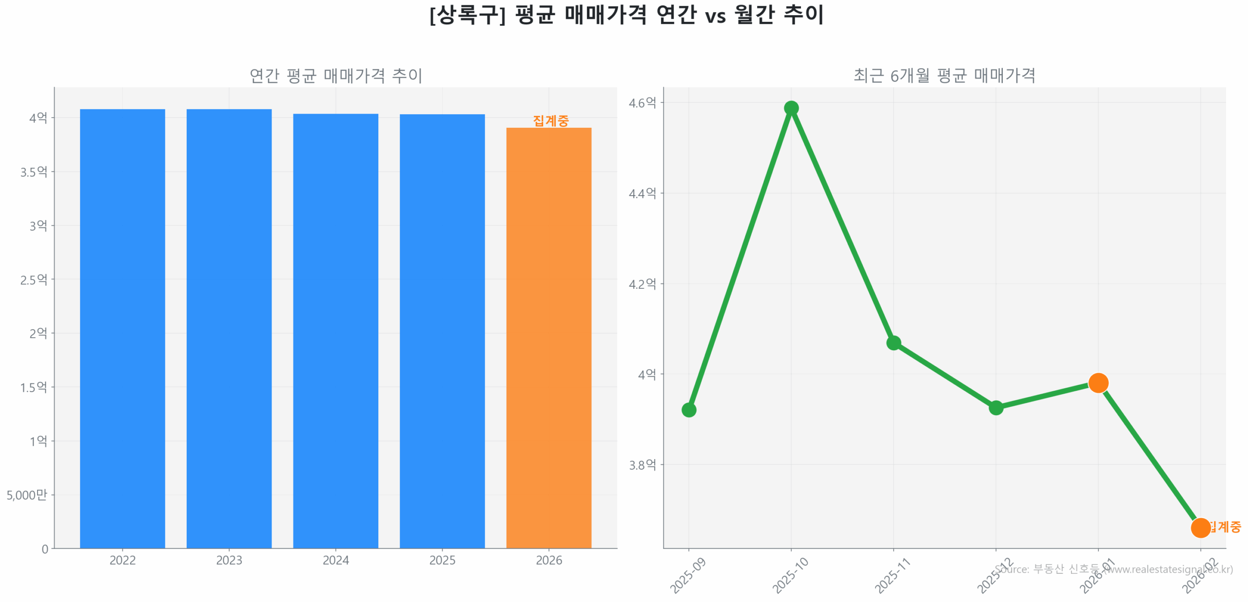 신고 시차를 보정한 2026년 2월 22일 확정 데이터 기준, 안산 사동 아파트 시장은 2022년 6월 고점(5억 4,896만 원)과 8월 저점(3억 6,200만 원) 사이에서 형성된 하락폭을 상당 부분 극복하며 역사적 저점 대비 62.6% 반등해 ‘회복(Recovery)’ 국면에 안착했습니다.