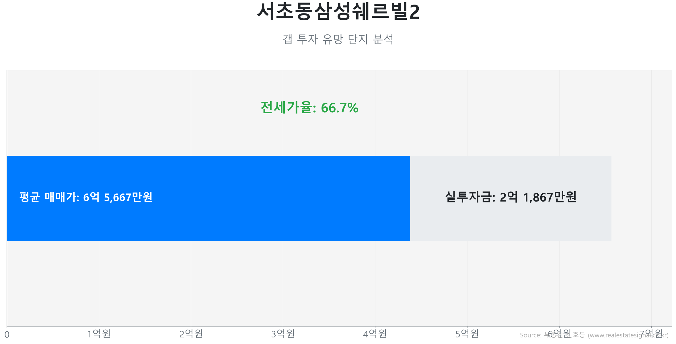 마지막으로 서초동삼성쉐르빌2(52.8㎡, 2002년 준공) 역시 전세가율 66.7%의 탄탄한 지지력과 전년 대비 20.3% 상승의 에너지를 뿜어내고 있습니다. 과거 갭투자 시 약 2억 1,867만 원이 소요되던 이곳은 규제 속에서도 전고점을 돌파하며 신혼부부의 똘똘한 한 채이자 핵심 실거주처로 주목받고 있습니다.