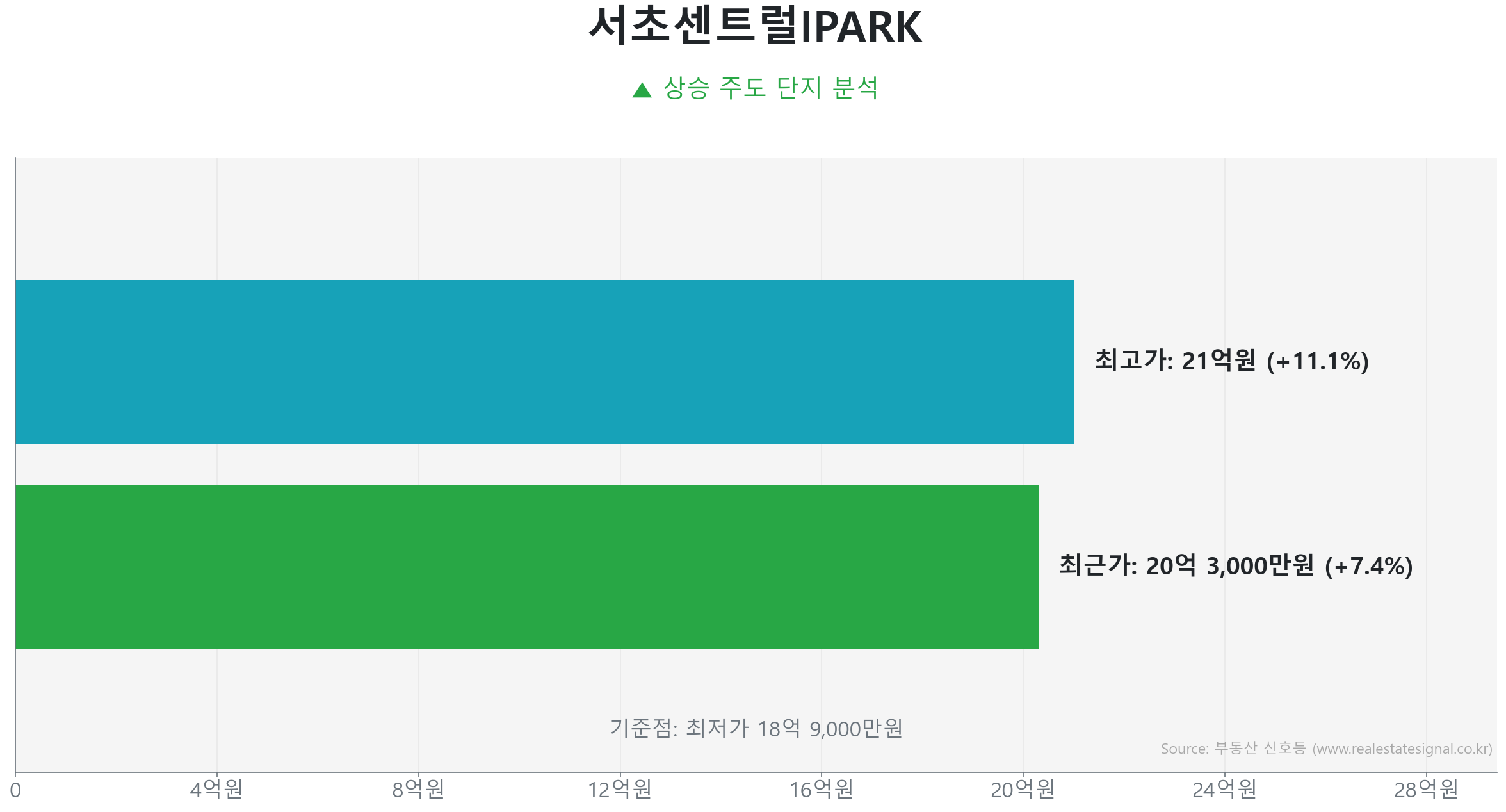 서초동 아파트 시세는 실거주 의무가 강화된 강력 규제 지역 환경 속에서 거래량과 가격이 동반 수축하는 ‘에너지 응축기’를 지나고 있습니다. 2025년 2월의 역사적 고점(27.6억 원) 대비 조정 기간을 거쳐 2026년 3월 잠정 저점(15.8억 원) 구간에서 지지선을 탐색하며 역사적 저점 대비 20.7% 반등한 ‘바닥권(Bottoming)’에 위치해 있습니다.