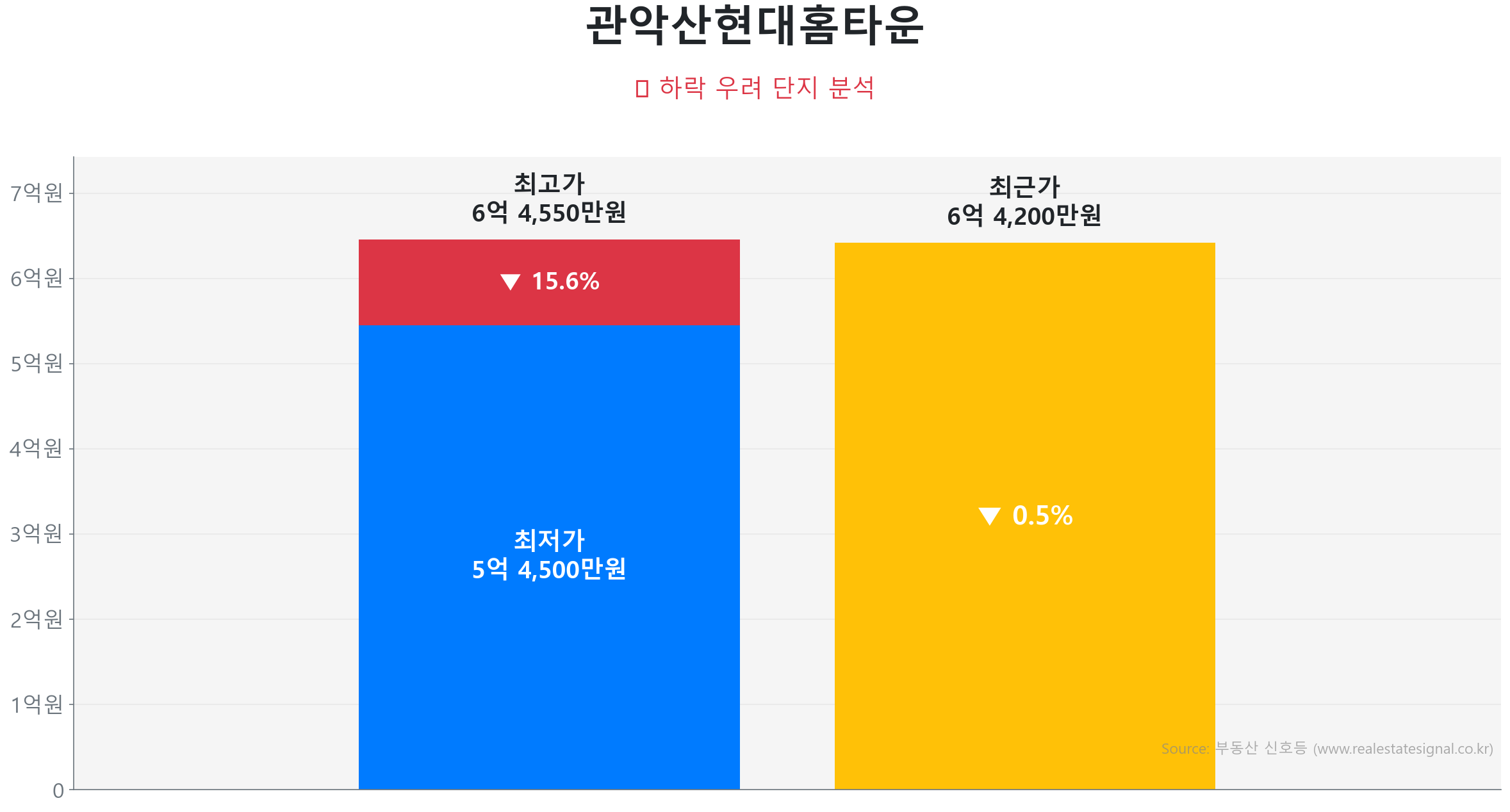 마지막으로 준공 24년 차 아담한 단지인 석수동 관악산현대홈타운 (59.0㎡) 역시 2026년 1월 6억 4,200만 원에 거래되며 고점 대비 0.5% 하락 수준에 머물러 사실상 숨 고르기(거래량 4건, 전세가율 61.2%)에 들어간 모습입니다.