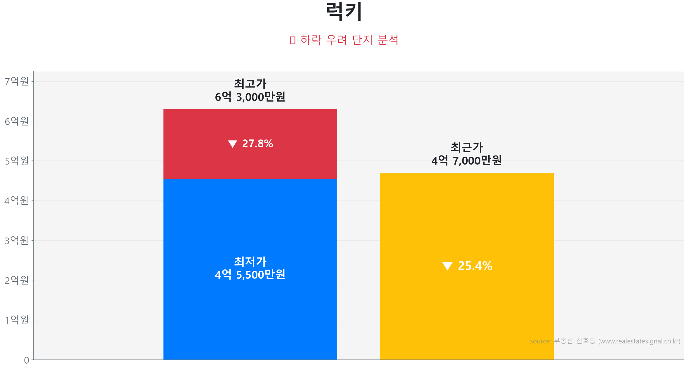 이어서 석수동 럭키 (76.6㎡, 준공 38년 차 중형 단지)는 노후화와 주차난으로 인해 2026년 3월 4억 7,000만 원에 거래되며 고점 대비 25.4% 하락(거래량 3건, 전세가율 60.5%)하는 등 깊은 조정의 시간을 보내고 있습니다.