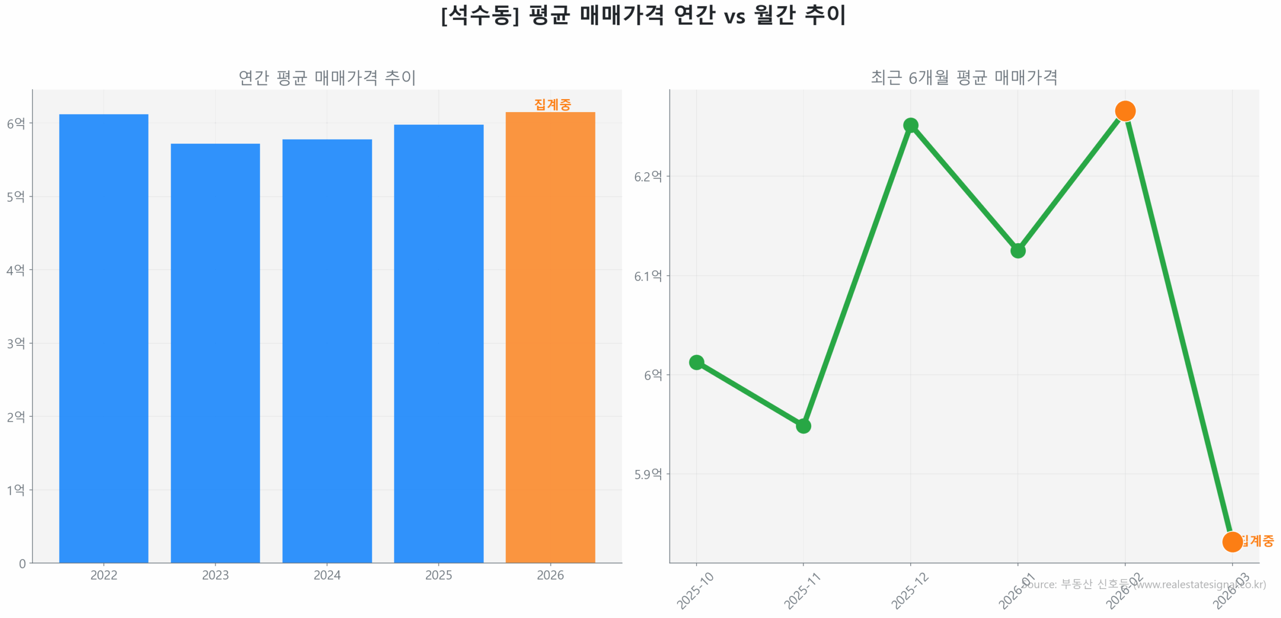 최근 3개월(2025년 12월~2026년 2월) 거래량은 65건을 기록, 전 분기 대비 24.8% 급증하며 매수 가속도가 붙고 있습니다. 반면, 평균 매매 가격은 6억 2,142만 원으로 3.1%의 완만한 상승에 그치며 보합세를 유지 중입니다.