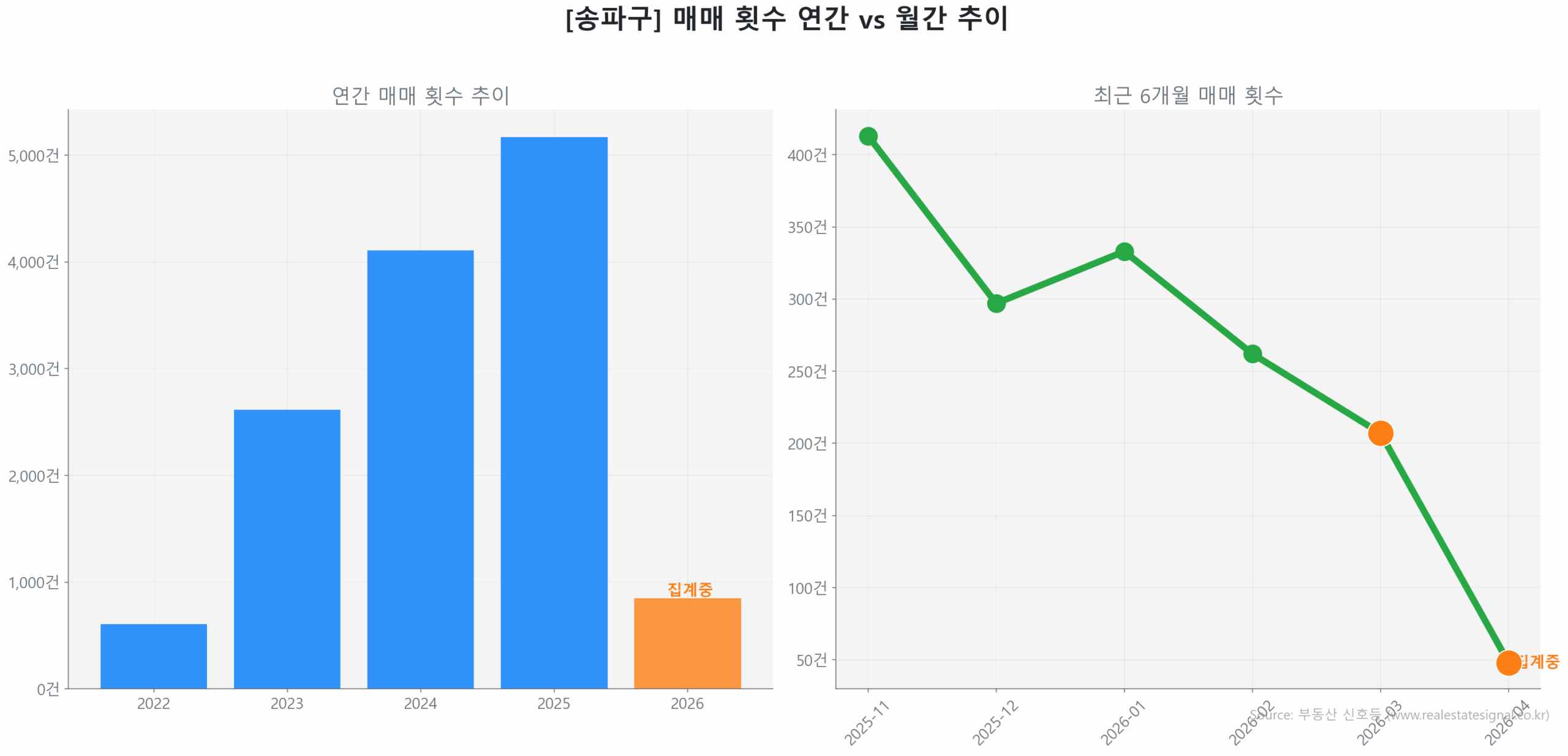 한편, 이러한 강렬한 상승 흐름은 신천동 장미1 (71.2㎡, 준공 47년 차)과 신천동 장미2 (71.2㎡, 준공 47년 차)에서도 확연히 확인됩니다. 한강변 대지 지분과 50층 랜드마크 기대감을 업고 결사대적 매수세가 유입된 장미 1차는 2026년 2월 30억 원에 거래되어 전년 대비 42.1% 상승하며 연간 11건 거래를 이끌어 미래 자산 가치를 입증했습니다.