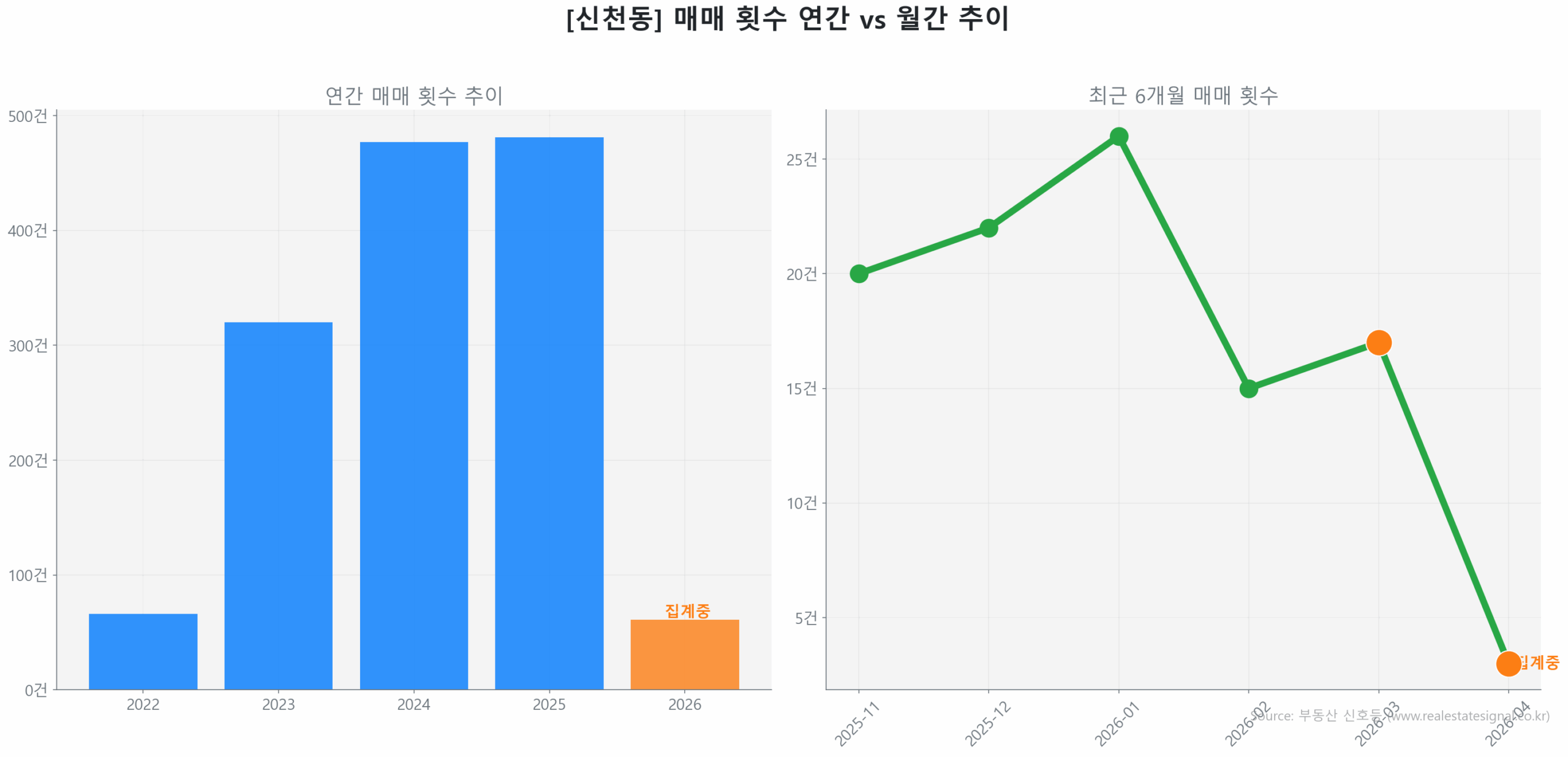 그럼에도 가격은 평균 27억 1,669만 원 선에서 +0.8%의 변동폭을 보이며 횡보 중입니다. 가격 수용도 지수가 11.8로 탄력적인 반응을 이끌어내고 있어, 현재 신천동은 거래량 실종 속에서도 가격이 하락하지 않는 강력한 하방 경직성을 동반한 정체기에 진입했습니다.