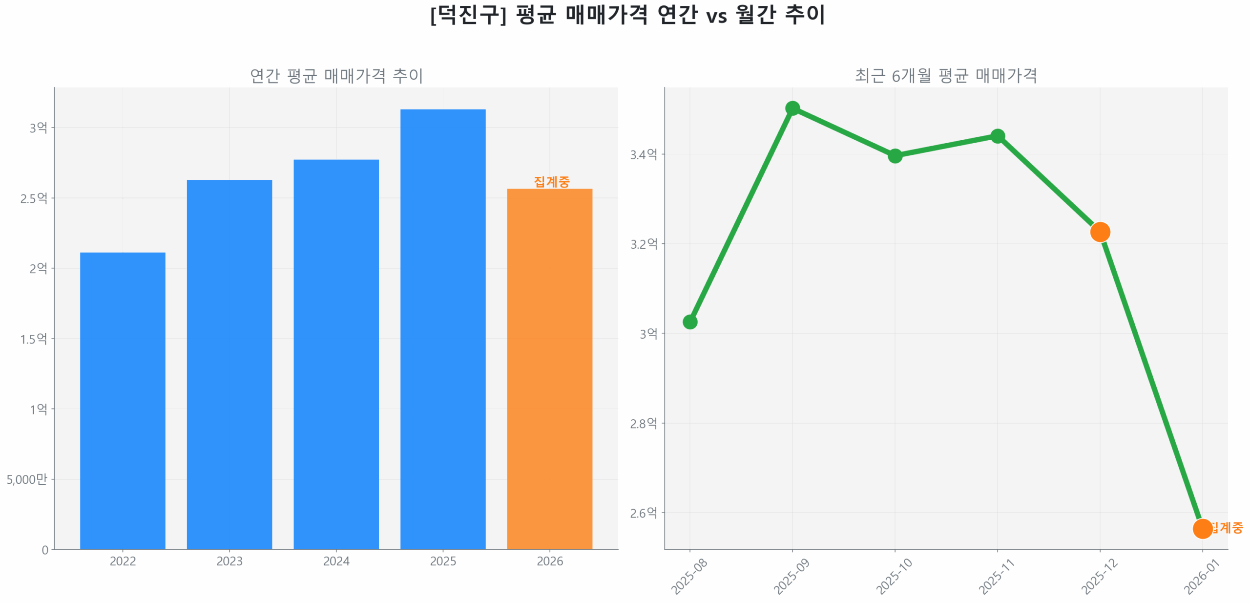 최근 3개월(2025년 10월~12월) 거래량은 전 분기 대비 29.4% 급증했고, 같은 기간 평균 가격 또한 5.8% 상승하여 거래량과 가격이 동반 상승하는 견조한 시장 에너지를 보여줍니다. 특히 시장 에너지는 ‘탄력적‘으로 진단되며, 구축 아파트가 전체 거래량의 98.6%를 차지하며 특정 세그먼트 중심으로 수요가 집중되는 안정적인 흐름을 보입니다.