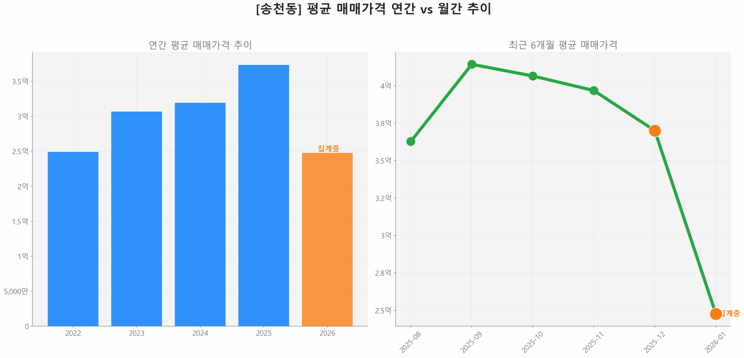 최신 실거래 데이터에 따르면, 송천동 시장은 최근 3개월(2025년 10월~12월)간 거래량이 29.4% 급증하고 평균 가격도 5.8% 상승하며 견조한 회복세를 보이고 있습니다. 특히 구축 아파트 중심으로 수요가 집중되는 안정적인 흐름입니다.