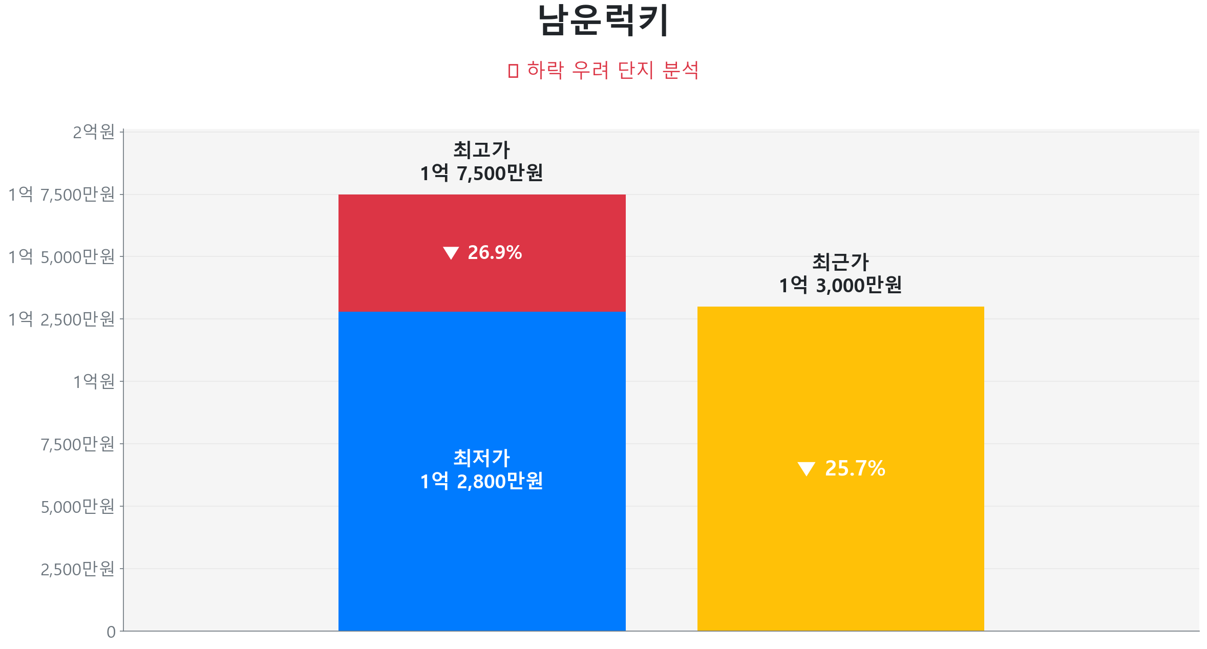 남운럭키 66.5㎡이(가) 고점 대비 26% 가격 조정되었음을 보여주는 그래프.