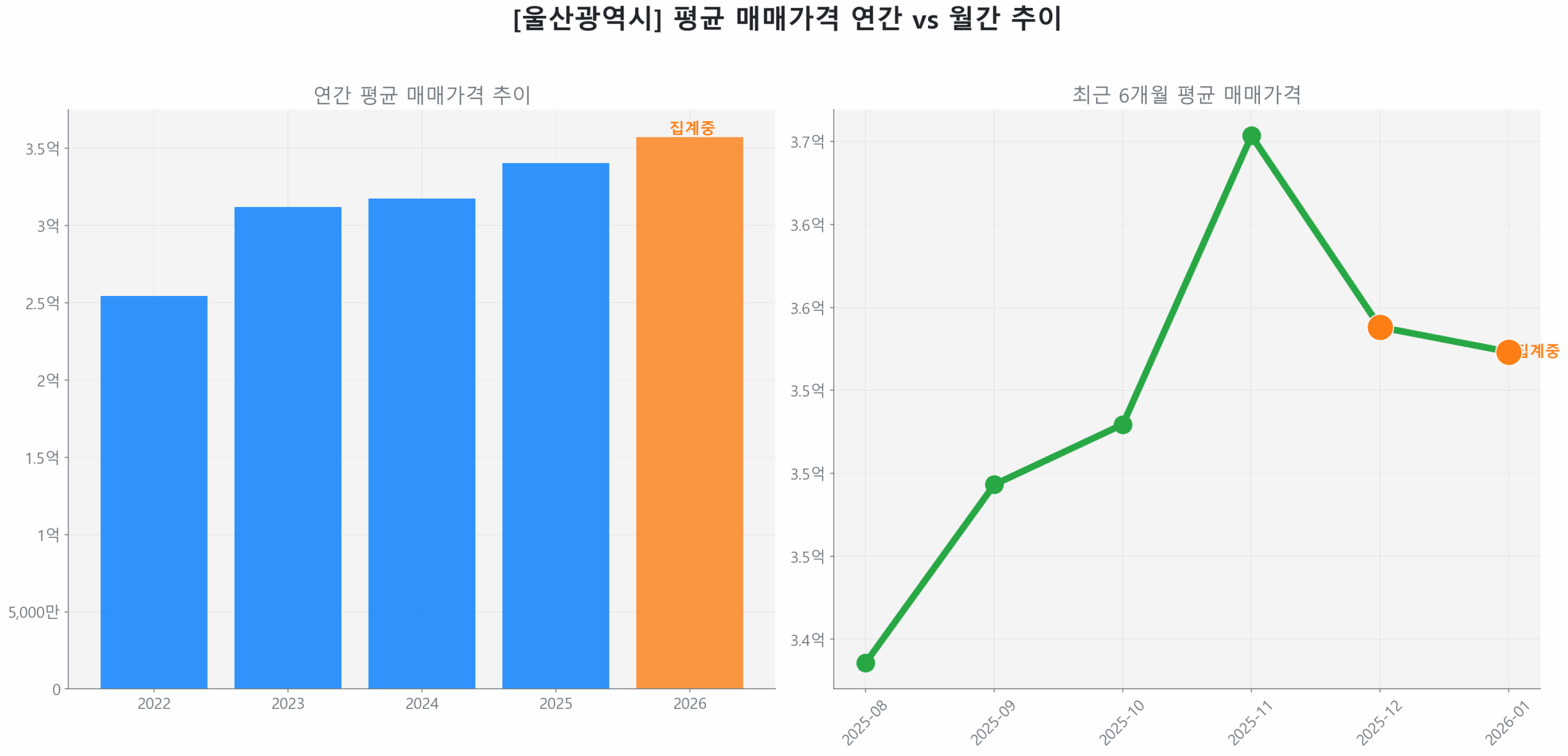울산 중구 아파트 시장은 저점 대비 100.0% 반등하며 회복 국면에 진입했으며, 전년 동기 대비 매수 가속도가 10.76%를 기록하며 가속화되는 양상을 보입니다. 이는 2026년 1월 저점(4억 514만 원) 대비 단기적 회복을 완료하고 2025년 12월 최고점(4억 598만 원) 수준에 근접한 상태입니다.