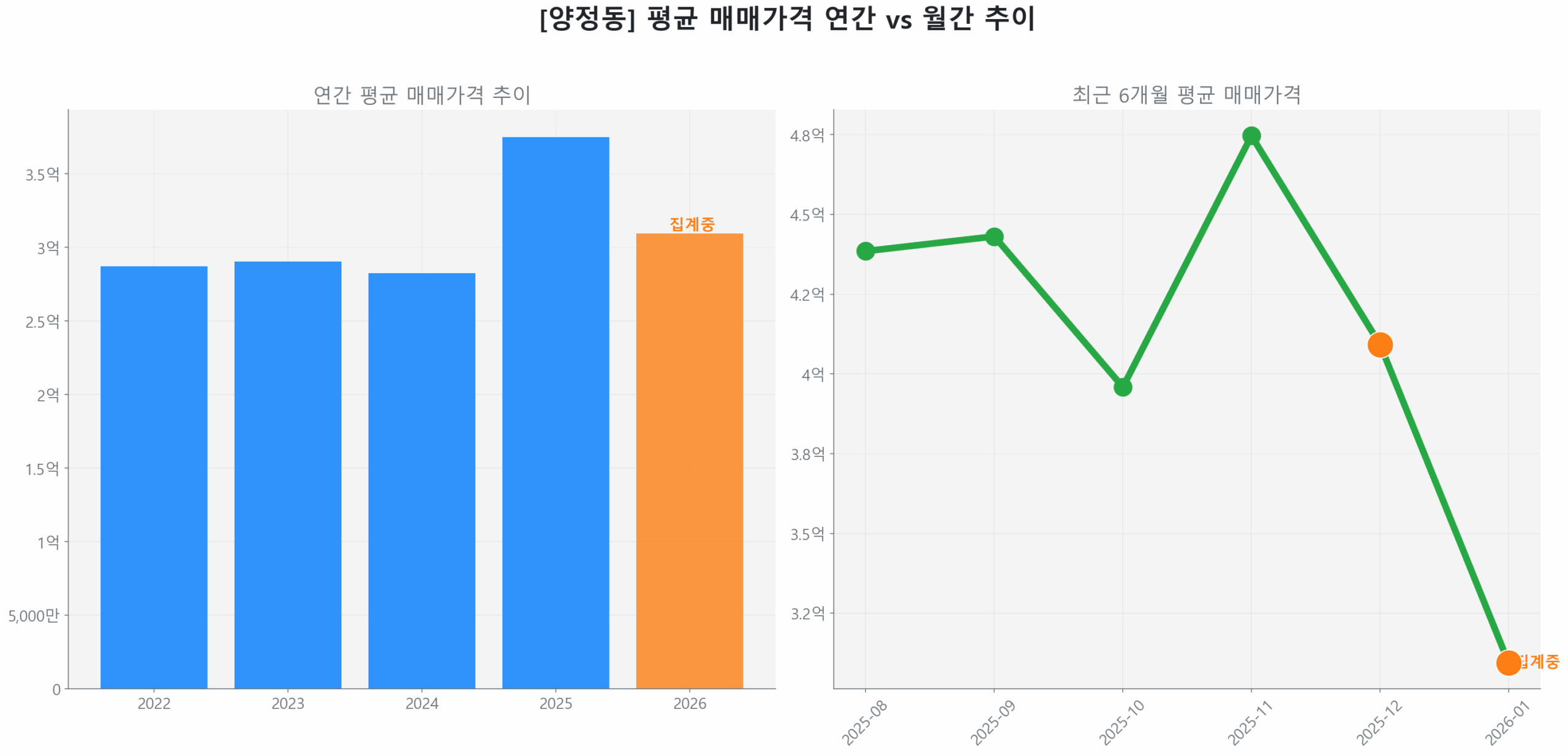 최근 3개월(2025년 10월~12월) 거래량은 53건으로 전 분기 대비 133.3% 급증하며 시장의 활기를 견인했으나, 같은 기간 평균 가격은 4억 2,660만 원으로 4.4% 소폭 상승하며 보합세를 유지했습니다. 이는 거래량 증가가 가격 상승으로 즉각 이어지기보다는 매물 소화에 집중되고 있음을 시사하며, 97.5%를 차지하는 구축 아파트 중심의 탄력적인 수요가 시장의 속도와 방향성을 결정하고 있습니다.