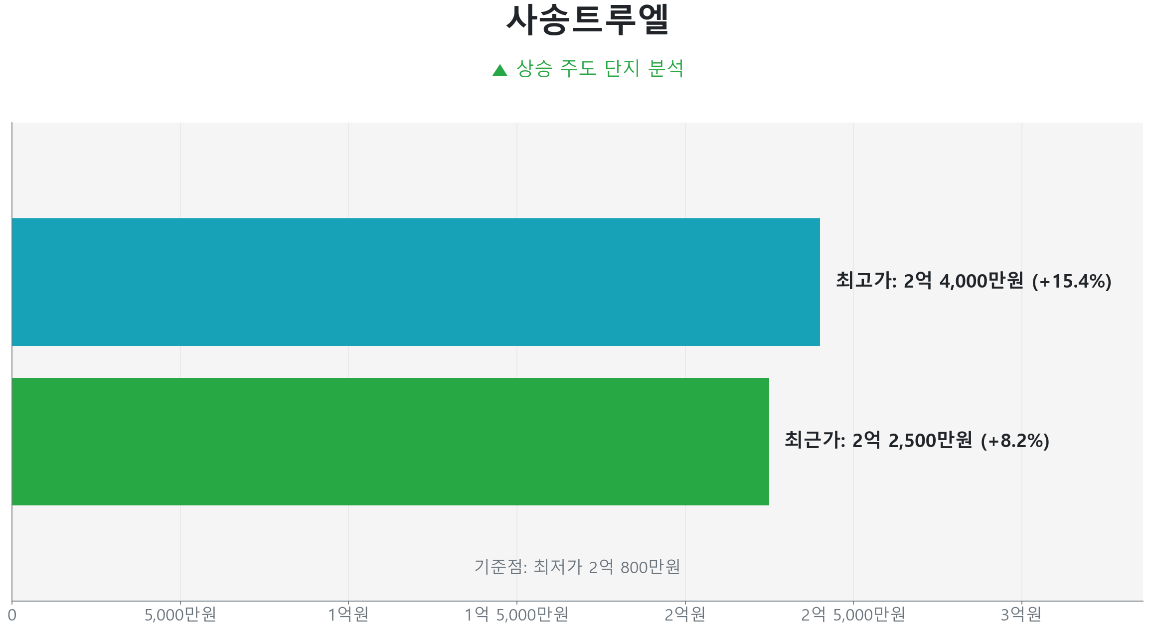 가장 먼저 주목할 곳은 동면 사송트루엘 (56.0㎡ 타입)입니다. 1188세대의 대규모 단지로, 준공 3년차 신축 아파트인 이곳은 현재 숨고르기 장세를 보이며 에너지를 비축하고 있습니다.