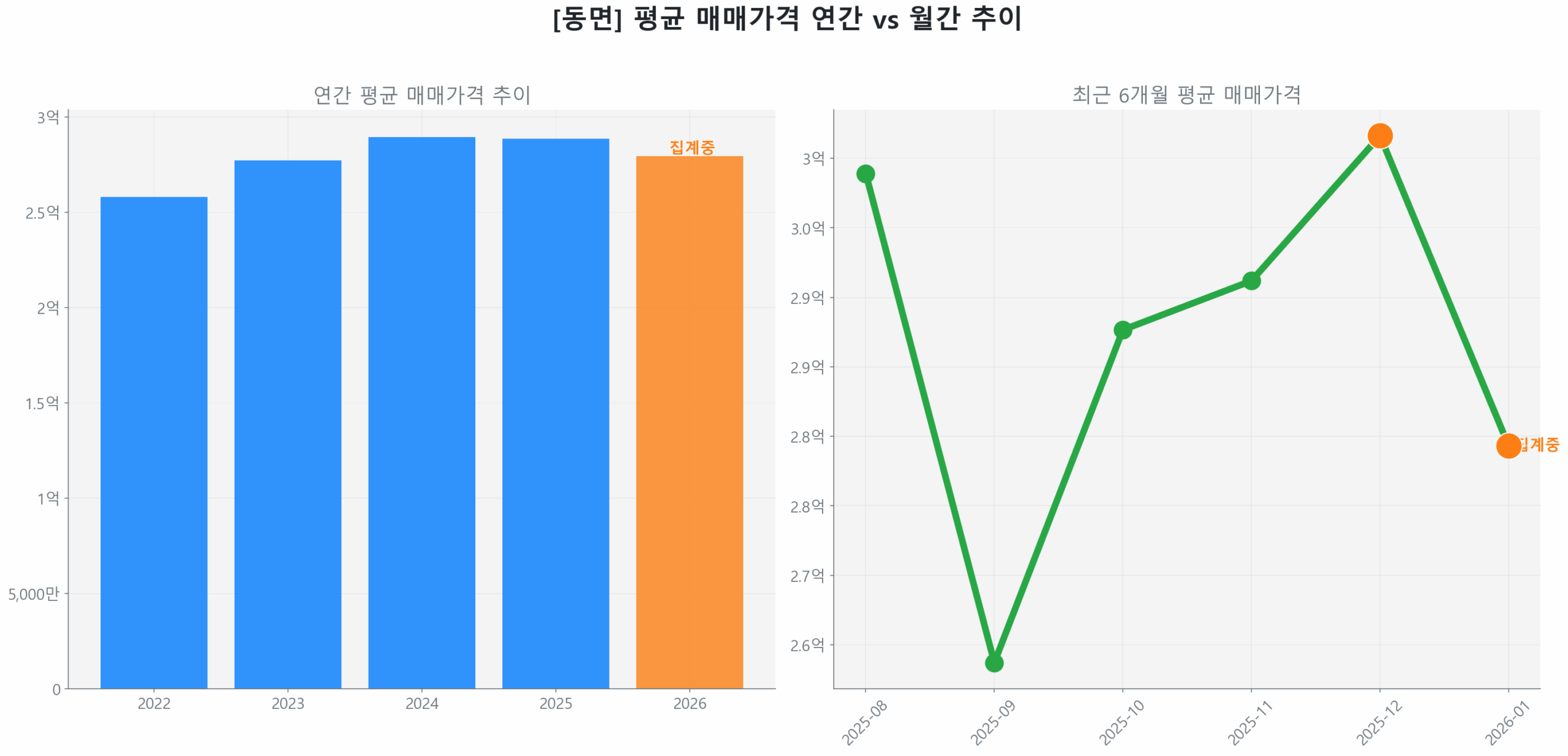 한편, 동면 더샵데시앙3차 (84.0㎡), 준공 1년차 신축 아파트 역시 숨고르기 장세 속에서 지난 2025년 12월 3억 9,900만 원에 거래되며 에너지를 비축하고 있습니다.
