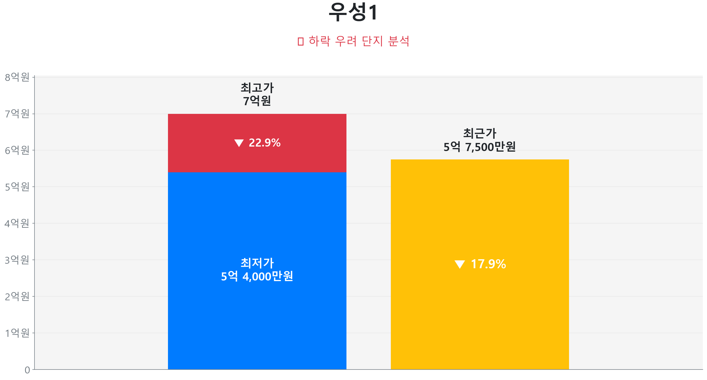 2022년 7월 4층이 8억 5,000만 원으로 최고가를 기록했으나, 최근 2025년 6월 8층 거래는 8억 원에 그치며 약세를 면치 못하고 있습니다. 이는 호가와 실거래가 간의 괴리가 발생하며 ‘미래 기대감’만으로는 가격 방어가 어려움을 보여줍니다.