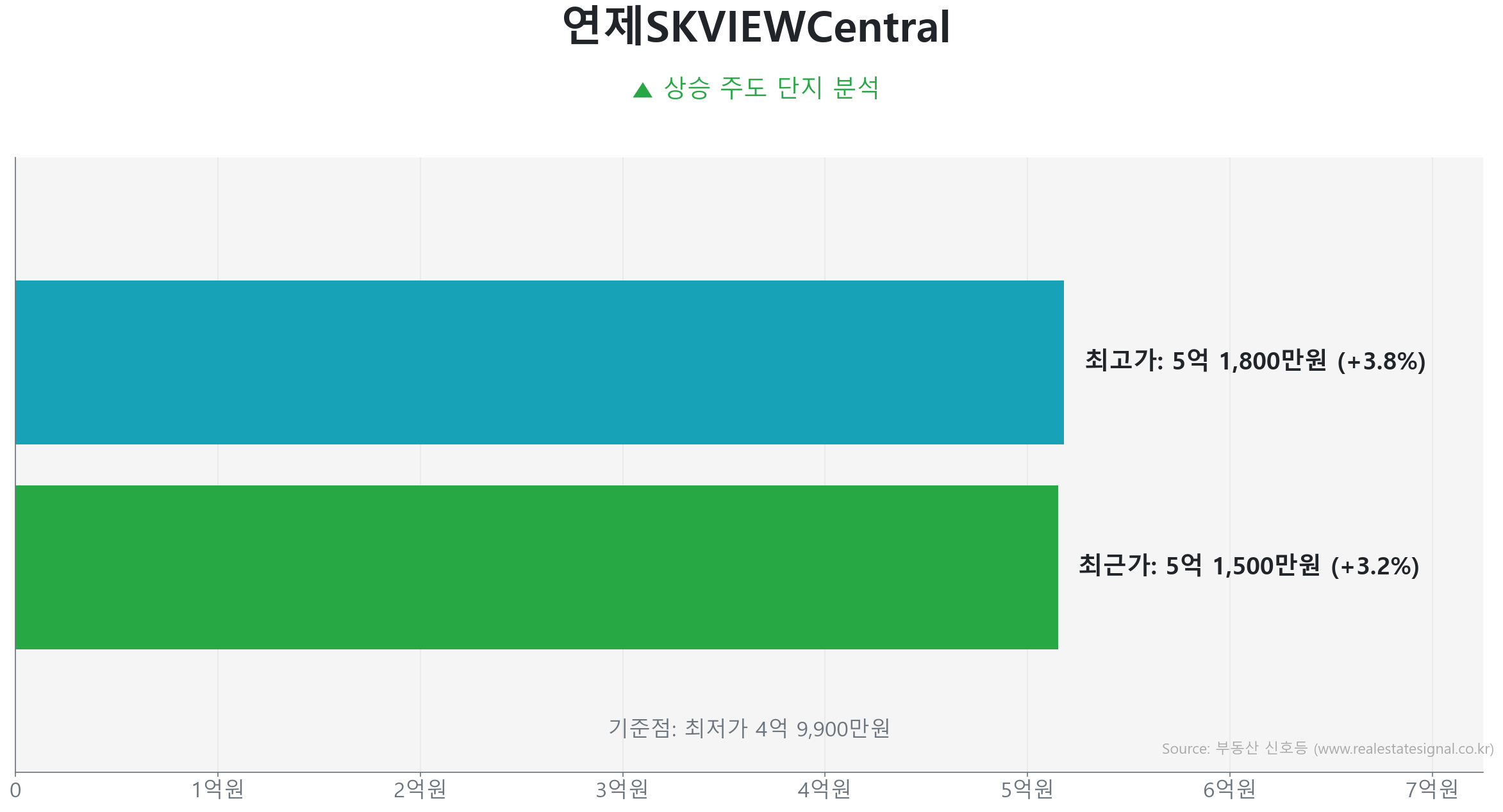 준공 2년 차 신축인 연산동 연제SKVIEWCentral (66.3㎡)에서는 매매가가 전년 대비 11.8% 상승하고 최저점 대비 3.2%의 반등세를 보이며 연간 거래량 12건을 기록했습니다. 2026년 2월 14층 매물이 동일 달 최고가에 근접한 5억 1,500만 원에 거래되는 등 작지만 강한 견고한 상승 흐름이 확인됩니다.