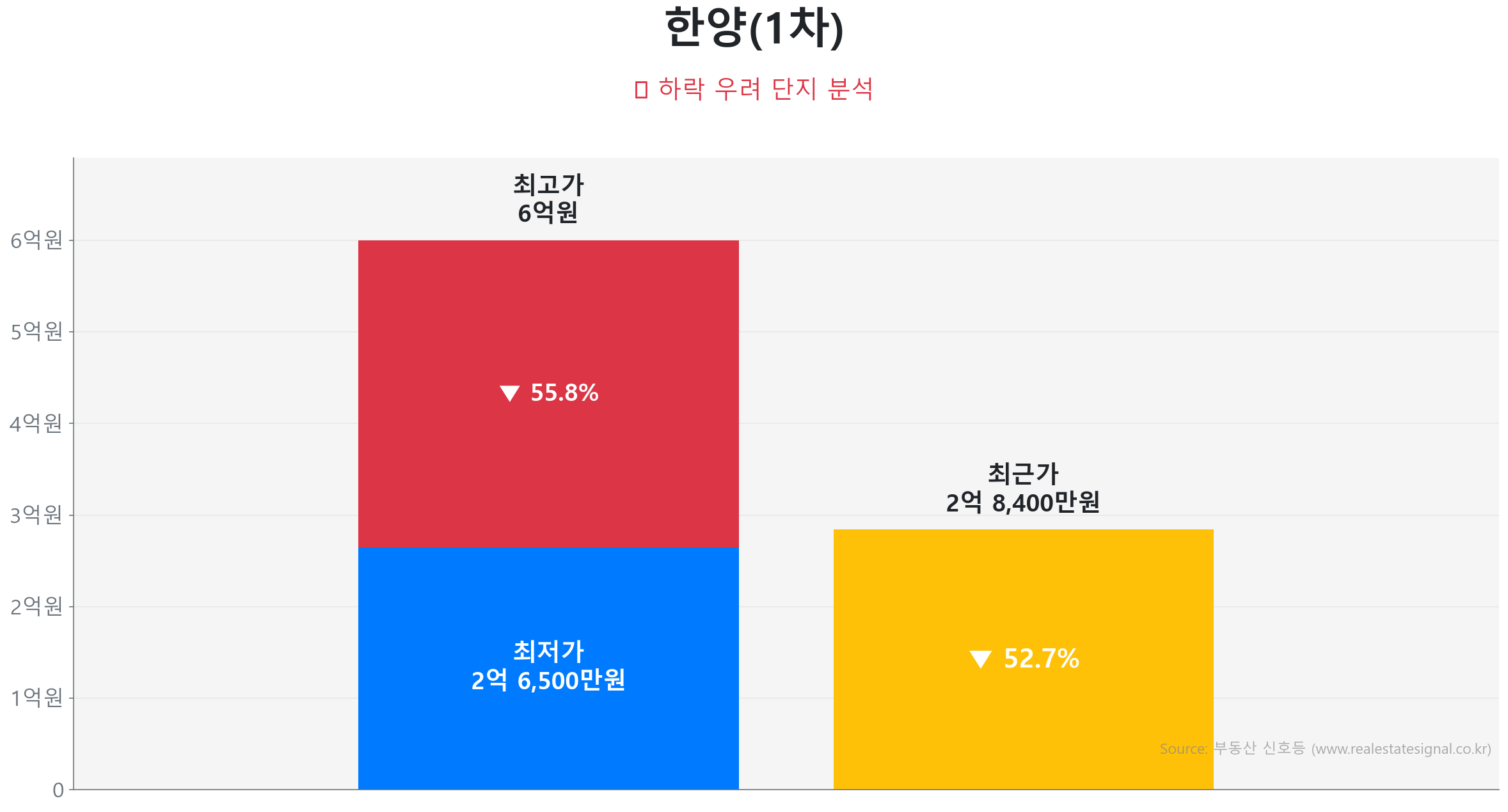 45년 차 노후 단지인 연산동 한양(1차) (62.9㎡)는 전년 대비 6.7% 하락했습니다. 2026년 3월 2층 매물이 고점 대비 52.7% 폭락한 2억 8,400만 원에 거래되며 잔혹한 조정을 겪고 있으나, 바닥 대비 7.2% 소폭 회복하는 모습을 보여 역설적으로 대지 지분을 절반 가격에 확보할 수 있는 구간임을 시사합니다.