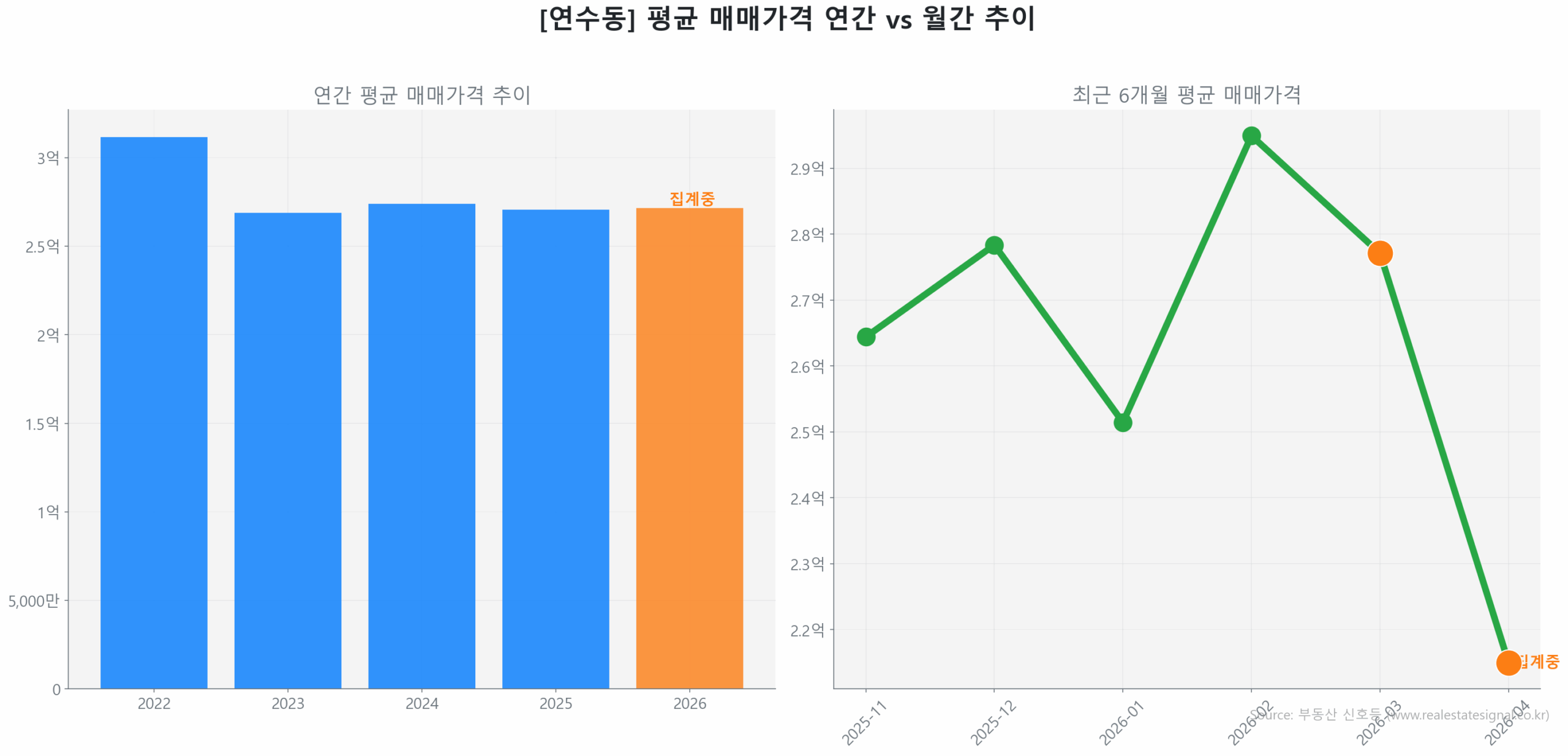 한편, 준공 28년 차 567세대 규모의 연수동 세경 (51.8㎡)에서는 77.2%의 높은 전세가율을 바탕으로 최근 29건의 거래가 발생하며 2026년 3월 2억 2,000만 원(6층)에 실거래가 보고되어 저점 대비 15.8% 반등하며 완만한 회복세를 이어가고 있습니다.